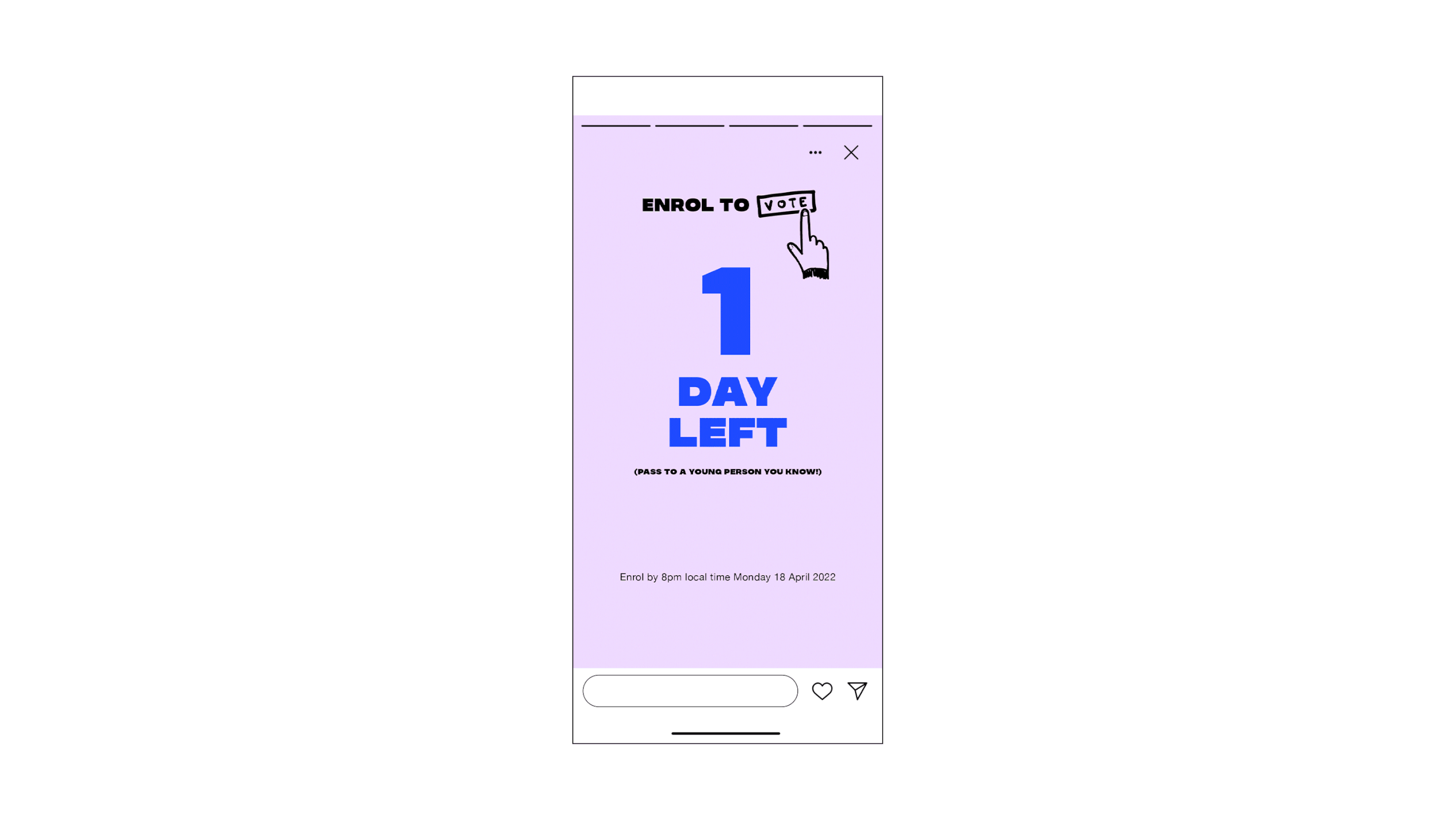 I designed a series of social posts and stories for the Enrol to Vote campaign, creating clear, engaging countdown visuals that encouraged participation and built momentum in the lead-up to the deadline.